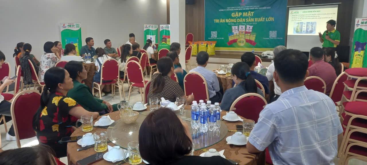Ngày 10/10/2024, PVFCCo-PMB phối hợp với Nhà phân phối cấp 1 Công ty TNHH Vật tư Tổng hợp Bắc Hà Tĩnh tổ chức thành công chương trình “Gặp mặt tri ân nông dân sản xuất lớn” tại huyện Vũ Quang, tỉnh Hà Tĩnh, nhằm tri ân tập thể nông dân tiêu biểu, sản xuất lớn tại địa phương và giới thiệu trọn bộ sản phẩm phân bón Phú Mỹ, chia sẻ kiến thức nông nghiệp một cách hợp lý, hiệu quả.